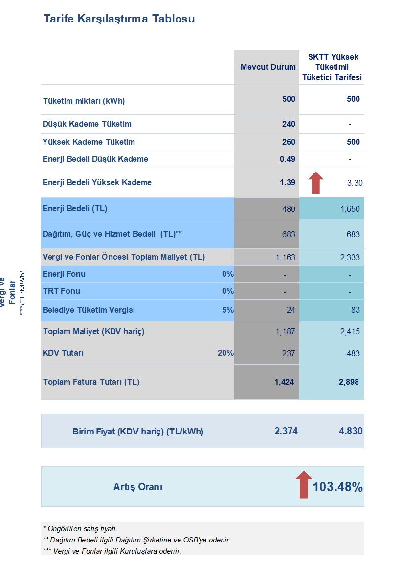 Enerji Piyasası Düzenleme Kurumu (EPDK) tarafından belirlenen tüketimi limitlerini aşan kullanıcılar ulusal tarifeden çıkarak, elektrik tedarikçisini seçmedikleri taktirde serbest piyasa fiyatları üzerinden %9,38 hizmet bedeliyle elektrik satın almak durumunda kalacaklar. EPDK tarafından yüksek tüketimli tarife, SKTT'ye geçiş limitleri şu şekilde belirlenmiştir: